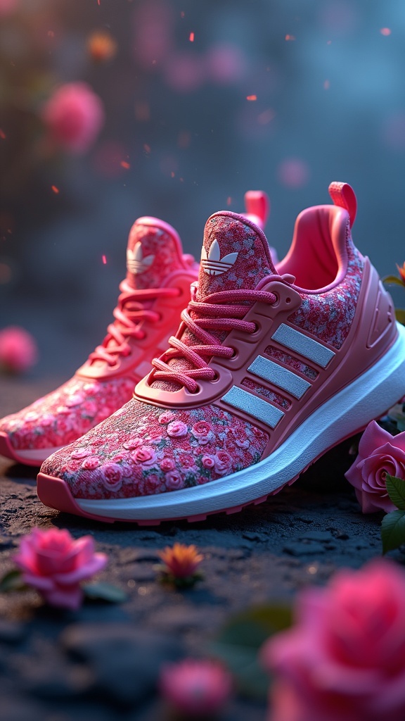 View this AI-generated image featuring disney beauty and the beast inspired adidas sneakers featuring vibrant colors and enchanted rose patterns captured in a stunning redshift render the digital art concept showcases the sneakers as a true masterpiece using octane render techniques for a photoreali