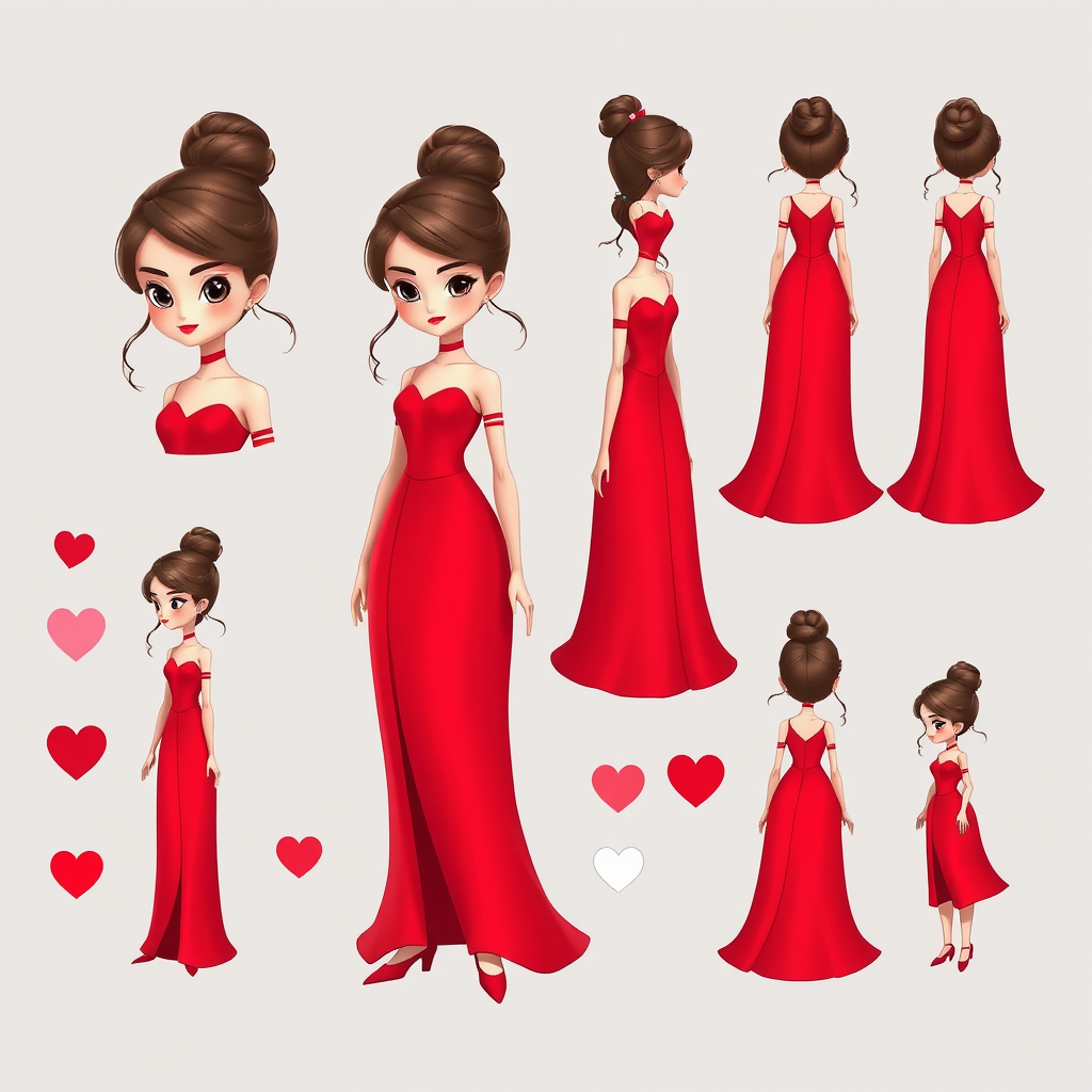 Disney-inspired character sheet, valentine-themed girl with neatly fastened top hair, showcasing a captivating red gown in 3D print style. The gown is visible in various views, maintaining a touch of creativity and uniqueness with minimal detailing. The character embodies a doll-like charm with multiple poses and expressions, a highly detailed design with depth and intricacy across numerous elements, presented in an aspect ratio of 3:4, with a stylized spin on classic elegance.