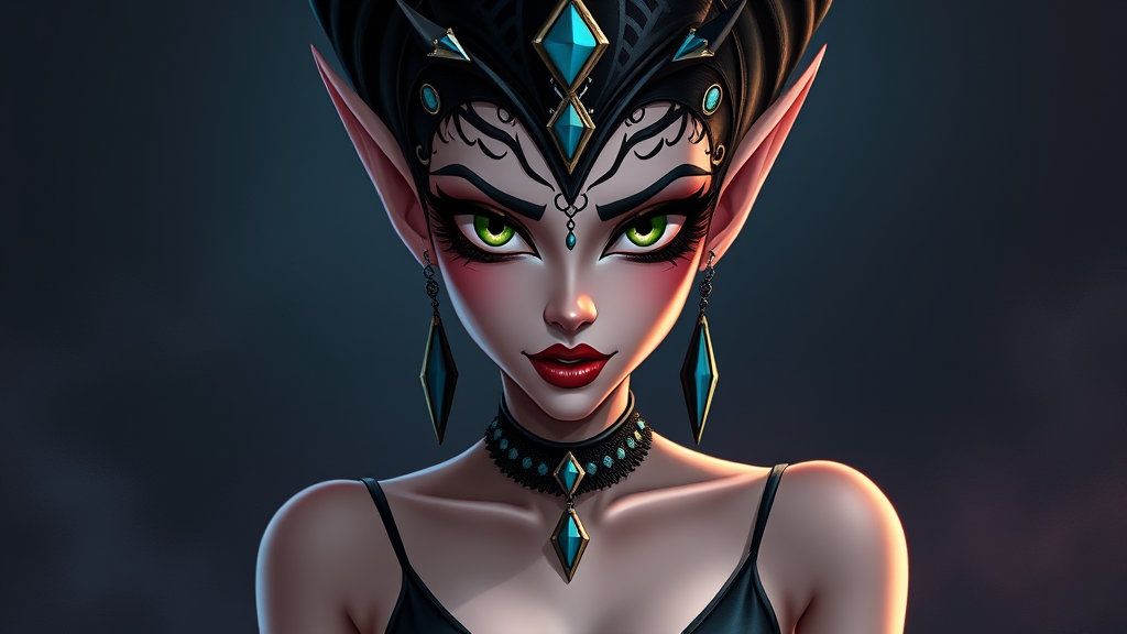 Disney's next captivating villain is a dark elf queen, whose beauty surpasses that of any Disney princess. Her face is adorned with intricate jeweled patterns, exuding an air of regal mystery. She stands elegantly in strappy heels, and her outfit features a plunging neckline that hints at both allure and power. Her anime-inspired face radiates mischief, rendered in stunning Disney animation style. The artwork is a high-quality painting in 16K UHD with HDR details.