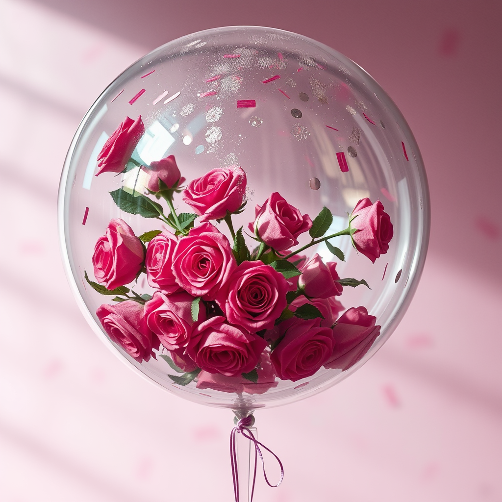 Disposable photography capturing an enormous crystal-clear balloon filled with vibrant roses and shimmering confetti, ultra-high resolution, photo realism, aspect ratio 3:4, ambient light casting gentle shadows, with the scene set against a dreamy pastel background adding a surreal touch to the composition.