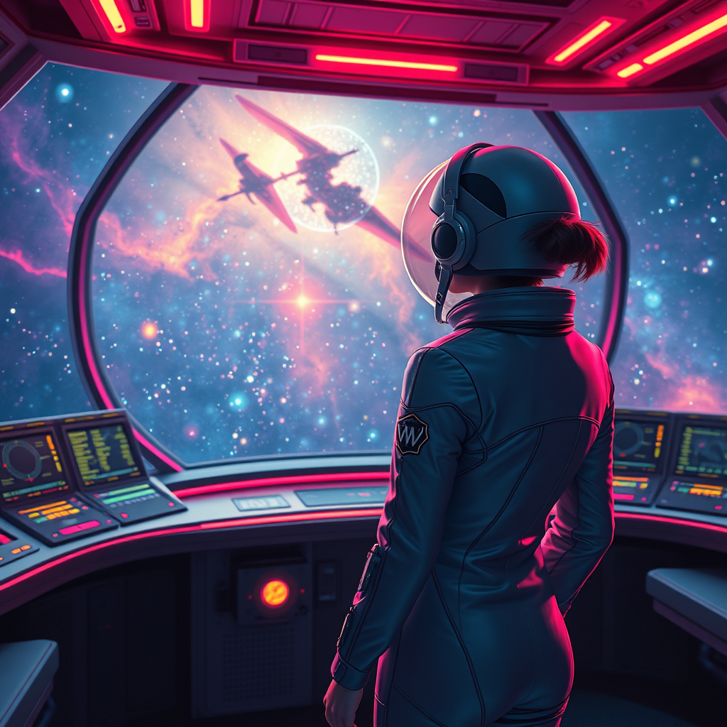 Distant view of a lone astronaut girl in a sleek uniform, standing inside a spaceship's command room, gazing at a mesmerizing galaxy outside. The setting is illuminated by vibrant sci-fi neon lights, casting an ethereal glow. The scene is intricate, exceptionally beautiful, and exudes elegance, with a high level of detail. The artwork resembles digital paintings found on ArtStation, capturing the essence of concept art with a smooth yet sharply focused illustration. The style is influenced by the works of Tian Zi, WLOP, and echoes the elegance of Alphonse Mucha's paintings, creating a singular, captivating image.