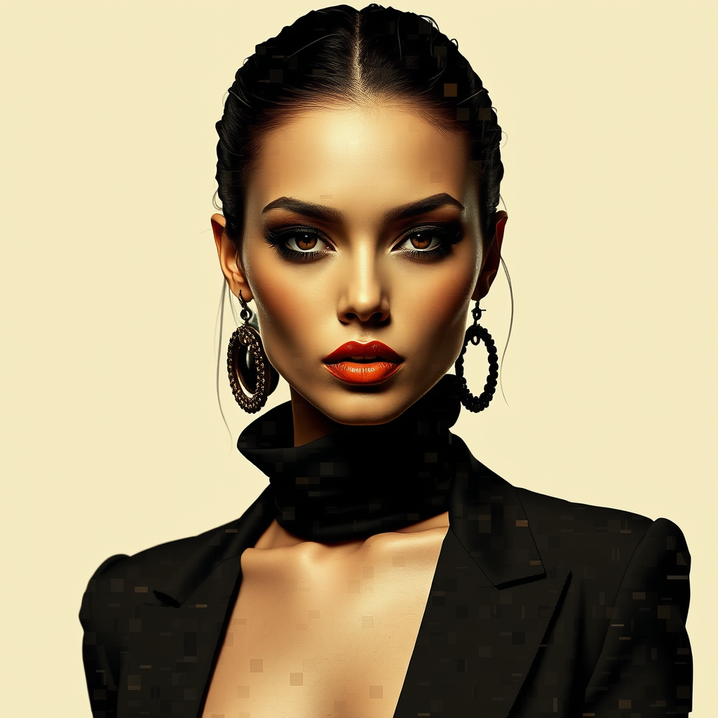 Distorted digital mosaic portrait, high fashion allure, luxurious designer elegance, muted earthy palette, lean silhouette, --ar 4:5