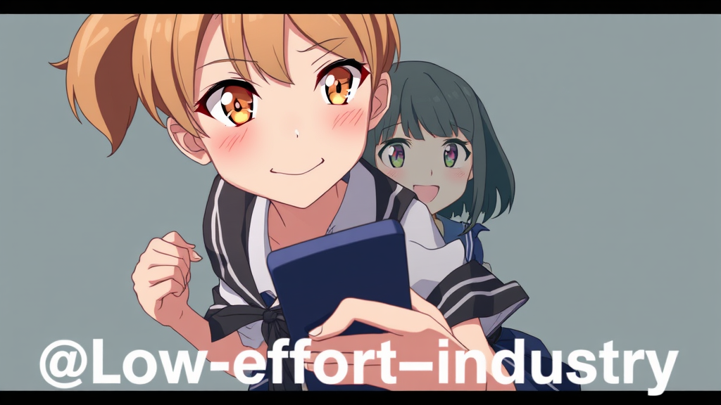 distorted view, 1girl, close-up, portrait, golden eyes, sly smile, looking away, dynamic pose, school uniform, pleated skirt, mobile astolfo low-res, error, text overlay, @low_effort_industry signature, gradients, deformed, unflattering, two girls, big grin, exposed shoulders