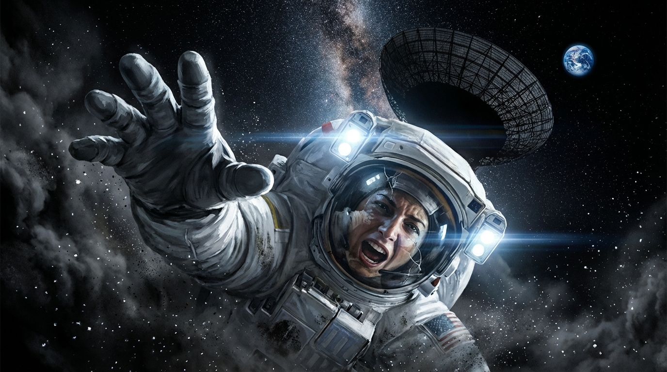 A dramatic sci-fi illustration captures a female astronaut in a desperate fall through space, her face contorted in fear within a cracked helmet. The scene is set against a backdrop of stars, a distant Earth, and a large satellite dish, emphasizing the vastness and danger of space.
