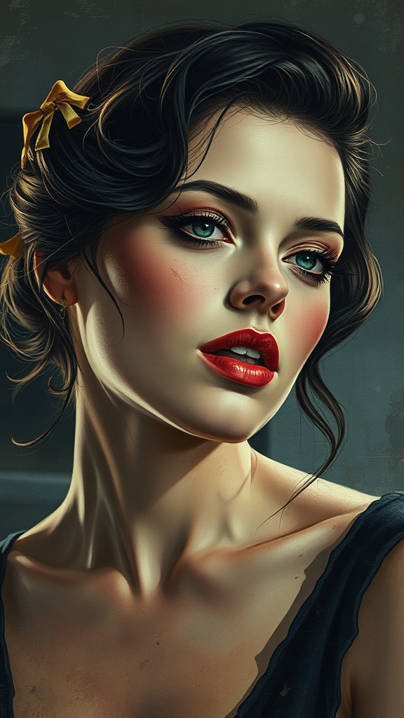 Distressed glamour portrait of a woman in a mashup of Mort Künstler and Robert WilliamService's illustration styles, with digitally deteriorated textures, damaging Jason Manzano's color grading, rumpled paper effects, grainy VHS Low res footage and crispy outdated flake texture, watercolor smudges overlaid with decayed Edgar Oswald Tarros classic matte prints, perforated film ripping, faked Super 16 negatives, magnified sorrowous cave paintings, shafts of light revealing utter gore and violence, foreboding redemption, dark!!<|reserved_special_token_183|>