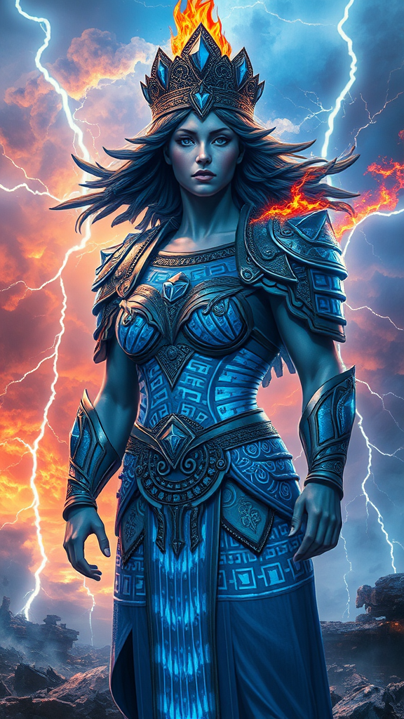 Divine Apocalypse: Goddess Athena Empyrean Inferno Goddess Athena stands amidst the remnants of a ravaged world, her iconic armor shimmering with intricate blue-infused hieroglyphics that reflect the auroral hues of the fiery tempests ravaging the skies. The air is electric, heavy with the promise of electrical discharges as towering thunderheads converge above. Behind her, a colossal Athena radiates an aura of might, the blue infernal flames crackling in her wake like an expansive brush stroke of ethereal paint. Arcing lightning spearheads her silhouette, illuminating her regal profile against a backdrop of vibrant, swirling chaos. Amidst this tapestry of raw energy, iridescent sparks dance like photons across her heroic visage, amplifying her already imposing presence. The face of the goddess is set in an expression of defiant resolve, flame-licked hair streaming behind her like a celestial banner. Dark, crystalline shards forming the armor on her arms actually emit intense, vibrant energy, bathing her surroundings in a kaleidoscope of978_, their light backlighting countless raging thunderheads.