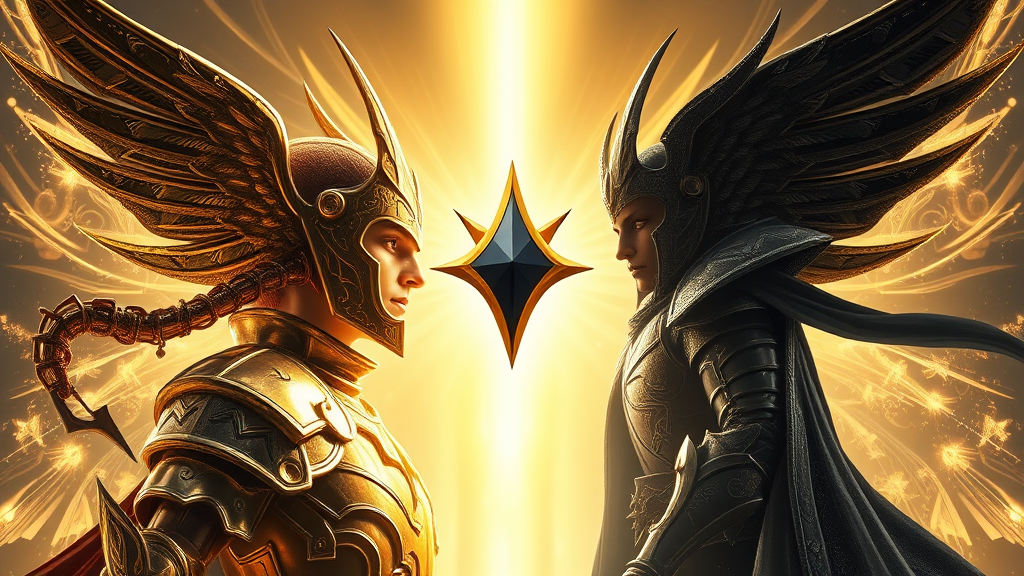 Divine armor of light and shadow, where the brilliance of gold meets the enigmatic allure of black diamond, symbolizing the eternal struggle between good and evil.