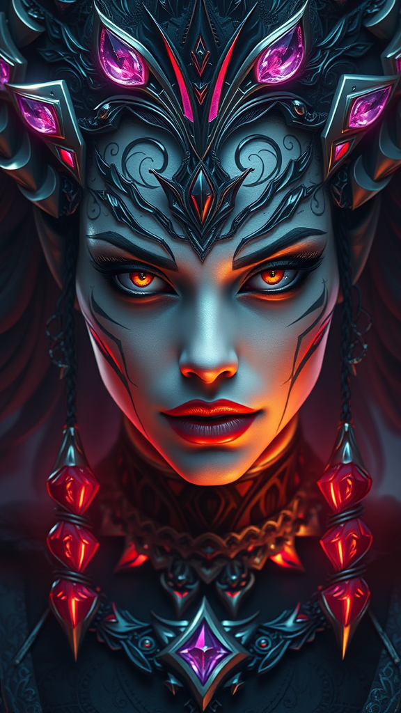 Divine Sorceress, Empress of Shadows, intricate facial features, ultra-detailed, cinematic illumination, flawless and captivating visage, impeccable composition, lifelike, technological tapestry, mystical realm, illustration, artstation aesthetic, shadowy fantasy, hyper-realistic vision, dramatic contrasts, vivid lighting, 8k resolution, ultra-refined 3D octane render, precise focus, wallpaper-ready, HDR brilliance, high-definition elegance, stylized 500, aspect ratio 2:3.
