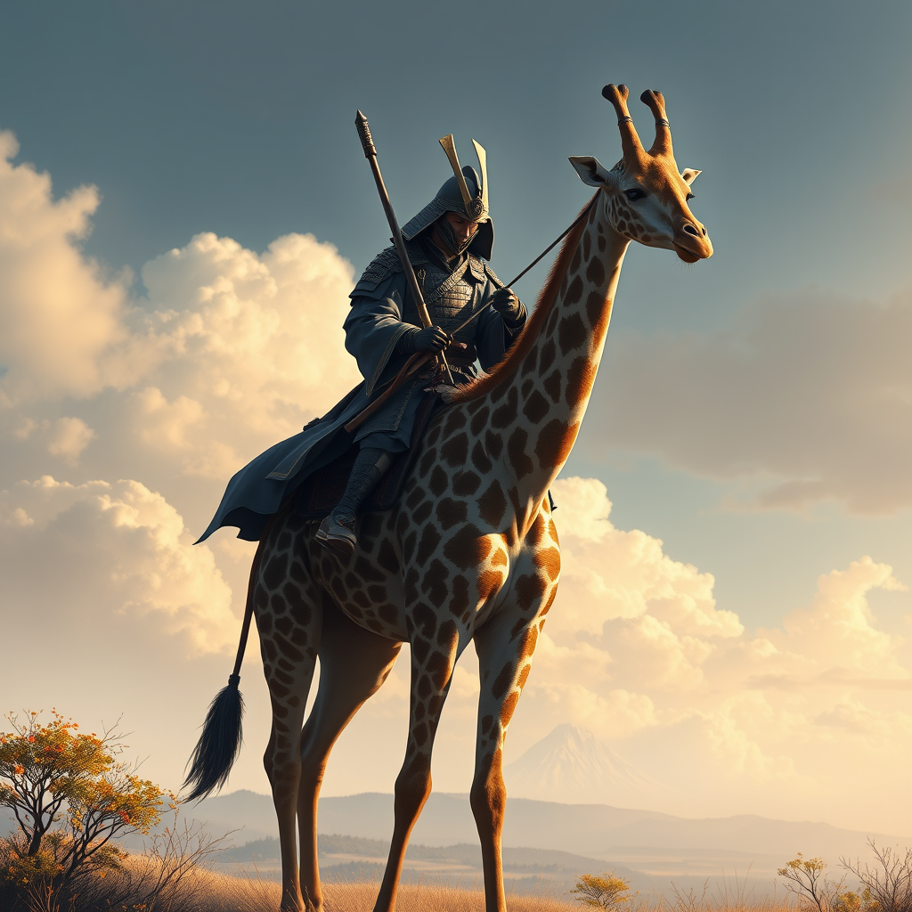 DNA-inspired vector artwork depicting a samurai mounted on a giraffe, illustrated in the emotive and photorealistic style akin to Dmitri Danish and Marcin Sobas. The scene captures the majestic poise and tranquility of the giraffe, while the samurai embodies strength and honor, creating a harmonious blend of contrasting elements. The background is a surreal, dream-like landscape that complements the elegance of the subjects, with gentle lighting to highlight their features in a vivid yet ethereal atmosphere.