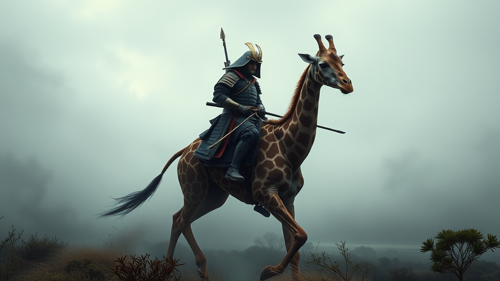 DNA-inspired vector artwork portraying a samurai majestically riding a giraffe through a misty landscape, capturing the emotive style of Dmitri Danish and Marcin Sobas. The image should evoke a sense of surreal adventure, with intricate details in the samurai’s armor and the giraffe’s patterned fur. The scene should emphasize a dreamlike quality with subdued colors that contrast against the photorealistic elements, highlighting the ethereal connection between the rider and the animal, set against a 3:4 aspect ratio.