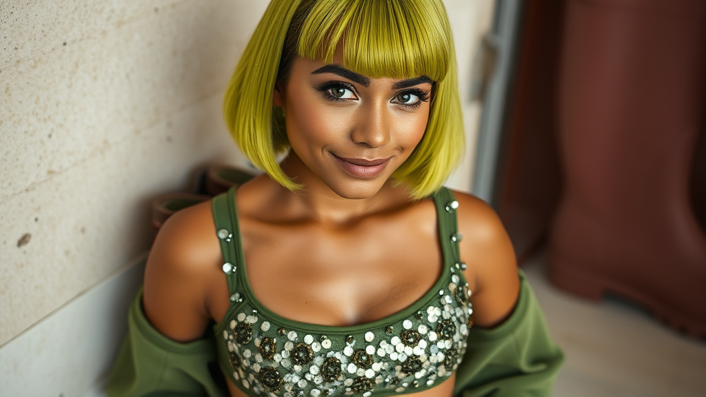Documentary photography captures an Autumn Fashion close-up of a 24-year-old Maranao-Guarani female circus performer with a subtle defiance in her expression. Her body exudes strength with a tight, flat stomach, visible muscle definition, and small, flat chest. Her golden brown skin radiates a gentle warmth, with pores and textures clearly visible. Her deep-set grey cat eyes are framed by long, elegant lashes, and her bob haircut with baby bangs is dyed a vibrant lime green. Her softly gradient-shaped brows complement her delicate facial features. She dons a sequin-embellished crop top that sparkles and shines, perfect for nighttime events or street parties, paired with low-rise velour tracksuit pants with a soft, plush texture for a retro street style. Positioned on the left side of the image by the rule of thirds, she stands with her hands resting on her waist, leaning slightly to one side with a soft smile that exudes approachability and warmth. In the background, a pair of rain boots stand in a puddle, with autumn leaves floating on the water’s surface. The scene is softly lit with natural lighting in an abstract style reminiscent of Oskar Fischinger, adding a dreamlike quality to the composition.