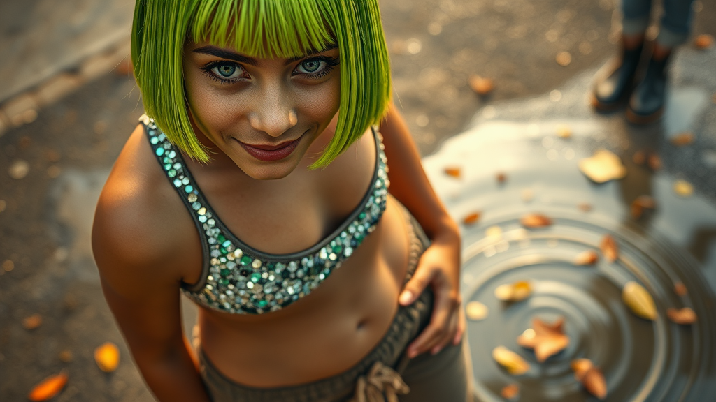 Documentary photography captures the vibrant essence of a 24-year-old Maranao-Guarani female circus performer exuding playful defiance. Her lithe body showcases tight, toned muscles with a flat stomach, highlighted by a glow of golden brown skin exuding subtle warmth. The close-up reveals skin texture with visible pores. Her deep-set, grey, cat-like eyes are framed by long eyelashes, exuding intensity beneath a bright lime green bob with baby bangs. Her softly shaped brown eyebrows enhance her delicate features. She wears a dazzling sequin-embellished crop top that sparkles brilliantly, paired with retro low-rise velour tracksuit pants of plush texture. Positioned on the left third of the image, she stands confidently, hands on waist, leaning slightly with a soft, approachable smile. The background offers a whimsical touch with rain boots in a puddle, leaves adrift on the water’s surface. Bathed in Oskar Fischinger-style soft natural lighting supplemented by fill flash, the scene captures an intriguing blend of boldness and charm.