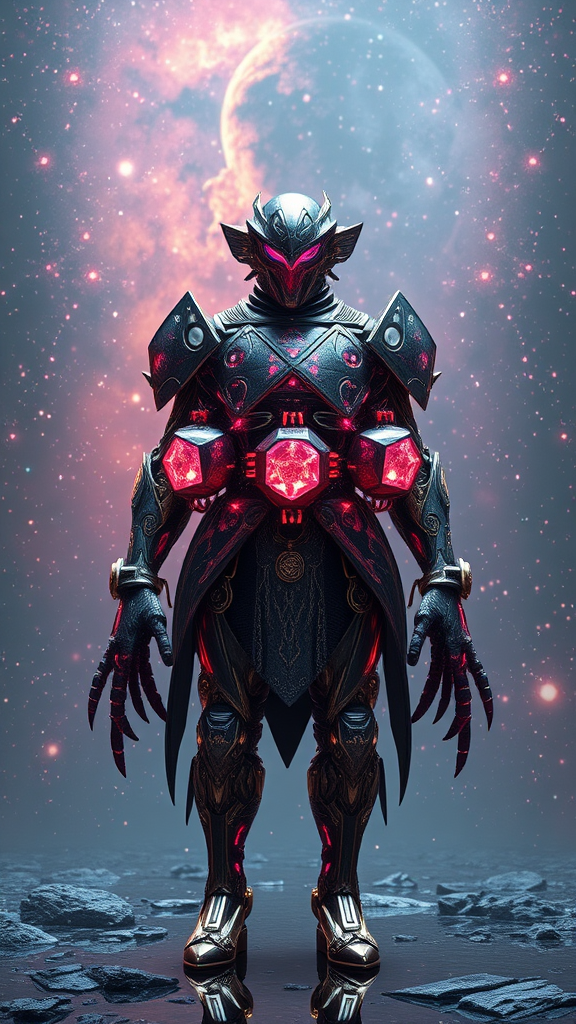 dodecahedron multiverse galaxy armor, high fashion, galaxy backdrop, t symmetrical composition, hyper realism, intricate detail, ultra-realistic octane render, galaxy reflections, vibrant and hyperrealistic, extreme details, unreal engine 5, cinematic masterpiece, 16k resolution, experimental proportions, extra limbs, unconventional anatomy, surreal and abstract design, digital art with a 3D aesthetic, exploring beauty in imperfection, intriguing and otherworldly, blending flawed and fantastical elements, avant-garde interpretation of cosmic themes.