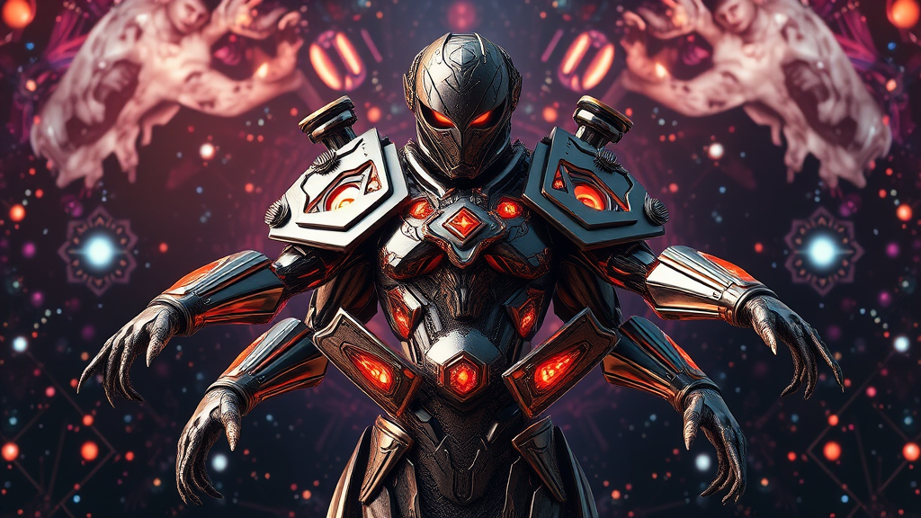 Dodecahedron multiverse galaxy armor with high fashion elements, set against a galaxy background with symmetrical artwork. The piece showcases hyper-realism with extreme detail, utilizing octane render and Unreal Engine 5 for a cinematic masterpiece. The design features galaxy reflections, detailed and bright textures, with ultra-realistic focus. The figure is characterized by surreal proportions, including extra limbs and distorted features, creating a mutated appearance that challenges traditional notions of anatomy. The character is reminiscent of a 3D doll, presented with an intentional play on poorly drawn hands and feet, and rendered with a mix of beauty and imperfection to evoke a sense of wonder and intrigue.