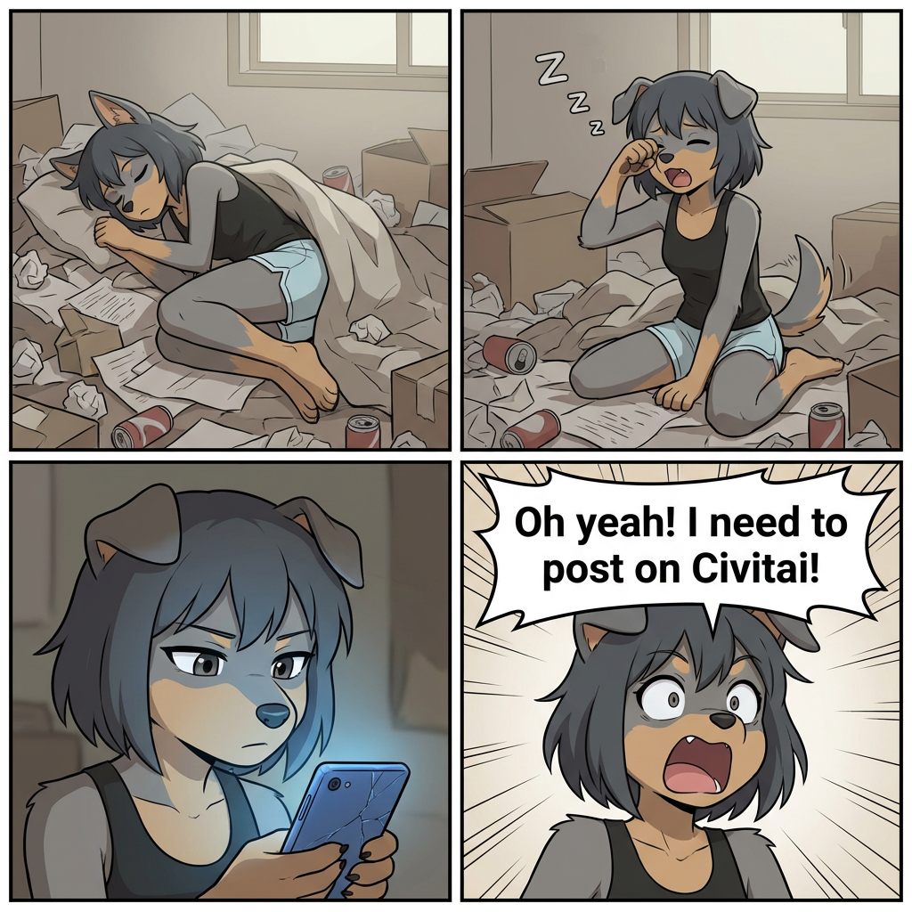 A four-panel comic strip featuring an anthropomorphic dog-girl with short dark hair, grey fur, and tan markings. Panel 1: The dog-girl is sleeping amidst a large pile of crumpled papers, cardboard boxes, and empty cans. She is wearing a black tank top and light blue shorts, with her tail visible. Panel 2: The dog-girl is sitting up in the same messy environment, rubbing her eye and looking tired. Zzz symbols float above her head. Panel 3: The dog-girl is looking at a smartphone with a cracked screen, held in her hands. The screen emits a blue glow onto her face. Her expression is serious. Panel 4: The dog-girl has a shocked expression with wide eyes and an open mouth. A speech bubble above her head reads "Oh yeah! I need to post on Civitai!". The background has motion lines, emphasizing her sudden realization. Art style: Digital comic art, clean lines, flat colors, anime-inspired character design. Lighting: Soft and ambient in the first two panels, with a blue glow from the phone in the third, and a brighter, more expressive light in the fourth. Colors: Muted and earthy tones for the environment (greys, browns, dull greens) with pops of color from cans. The character's colors are dark grey, tan, and black. Atmosphere: Initially sleepy and messy, transitioning to a moment of sudden realization and urgency.