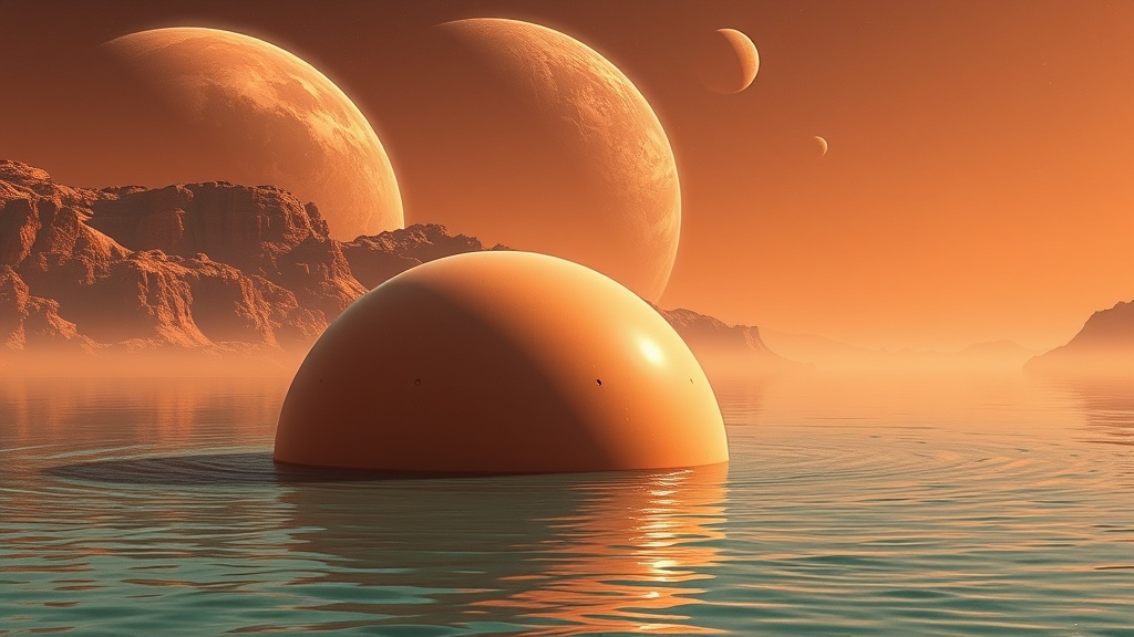 A single dome-shaped object partially submerged in serene water, capturing the essence of science fiction art with a tonalist color scheme of light orange and subtle crimson. Bathed in natural light, the scene conveys romantic desertpunk vibes with hyper-realistic details, as if shot with a Samyang AF 14mm f/2.8 RF lens. This digital masterpiece depicts a green city nestled beneath the backdrop of distant planets in a style reminiscent of eroded interiors. The color palette embraces hues of light red and orange, skillfully crafted by Daz3D, juxtaposed against an Australian landscape. The photo, reminiscent of a Nikon D750 capture, mesmerizes with transfixing marine views, created with ultra-realistic, hyper-detailed rendering in 32k UHD. A captivating digital fantasy that invites viewers into a world of awe and wonder.