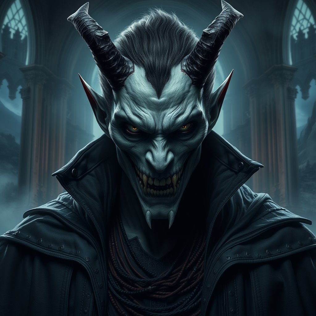 Dominant ancient Strigoi vampire, exuding an aura of primal terror and ancient wisdom, depicted in ultra-high detail. The setting is eerie and atmospheric, with shadows enhancing the supernatural features of the vampire. His piercing eyes and sharp features reflect his superiority and cunning intelligence. The background is a blend of gothic architecture and misty landscapes, adding depth and mystery to his presence. The overall composition is striking and vivid, with a high dynamic range capturing every intricate detail of his menacing form.