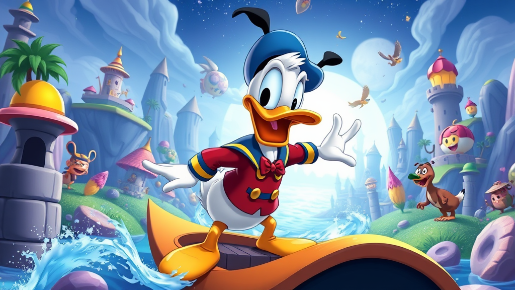 Donald Duck adventure in the metaverse, animated as a hilarious 4K ultra HD Disney cartoon where Donald navigates through a vibrant digital world filled with quirky NFT characters and comical challenges.