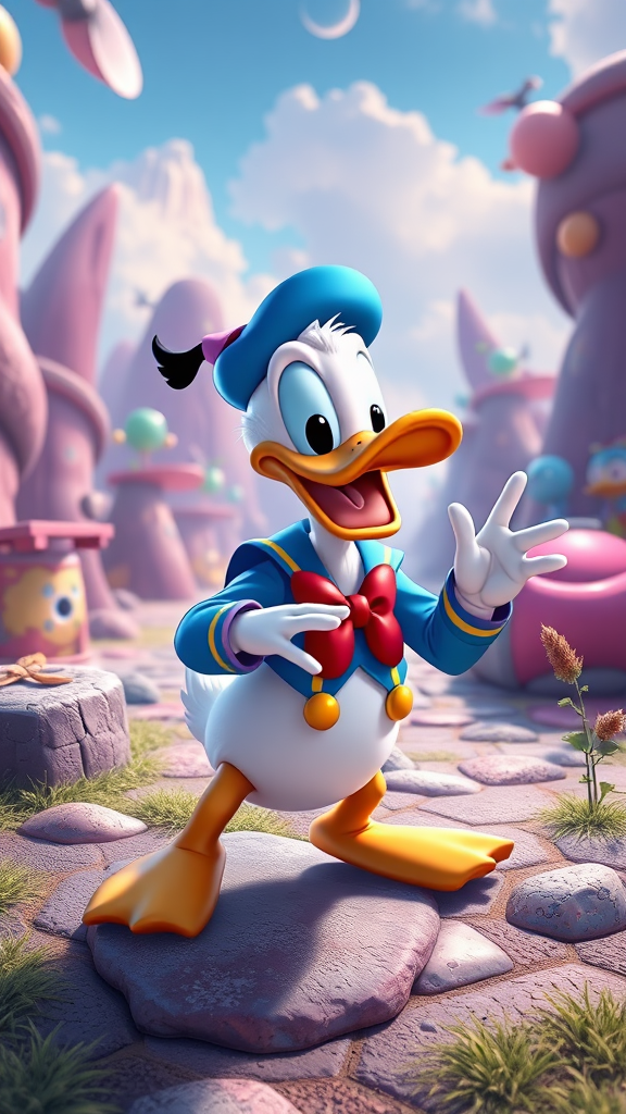 Donald Duck cartoon in a vibrant, ultra HD 4K metaverse setting, surrounded by whimsical, digital landscapes. He fumbles humorously with NFTs that come to life, showcasing Disney magic in a futuristic virtual world, filled with laugher and unexpected adventures.