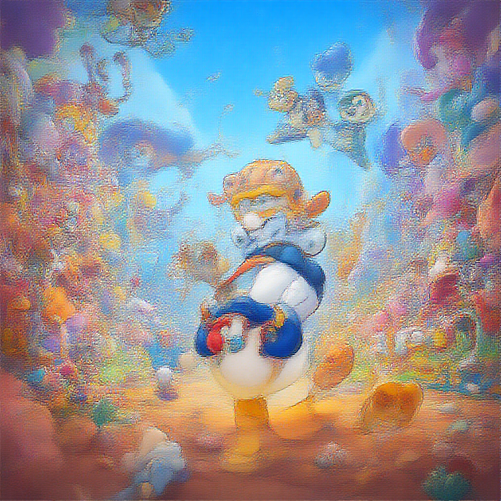 Donald Duck navigating a colorful and whimsical metaverse world, surrounded by vibrant NFT-inspired digital art, engaging in humorous antics with iconic Disney characters, all rendered in ultra HD, 4K quality for a stunning visual experience.
