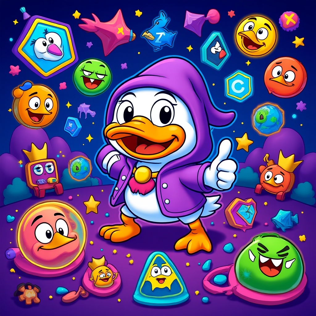 Donald Duck navigating a whimsical metaverse, stumbling upon vibrant NFT collectibles in a hilarious quest, ultra HD 4K animation, Disney inspired, rich colors, comedic elements throughout.