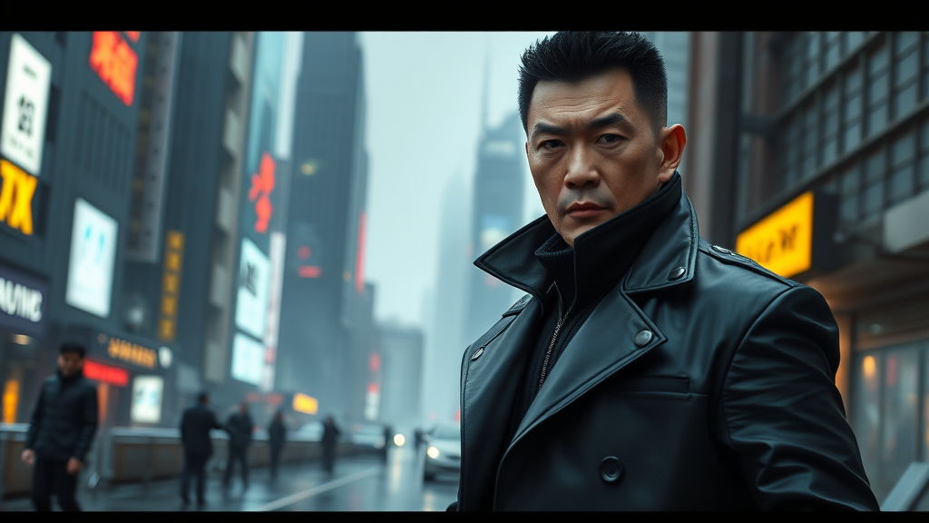 Donnie Yen depicted as a futuristic supervillain wearing a sleek black coat, captured in striking hyperrealism. The scene is rendered in photorealistic 8k quality using Unreal Engine, enhancing the 3D depth and dimensionality. Set in a dystopian urban landscape, the background contrasts with his enigmatic presence. The atmosphere is electrified with expressive style, emphasizing a dark yet charismatic aura. The details of the coat reflect cutting-edge technology embedded within, highlighting his powerful and menacing role in this cybernetic future.