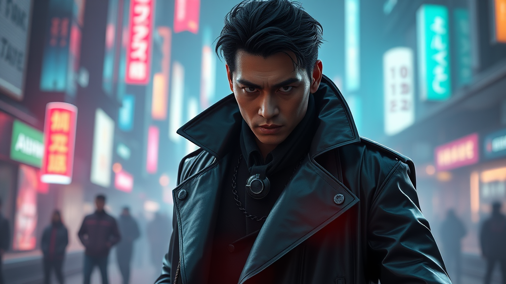 Donny Yen as a futuristic supervillain in a sleek obsidian trench coat, set in a hyperrealistic and photorealistic style, rendered in stunning 8k using unreal engine, 3d graphics. The scene captures a dynamic and expressive atmosphere, showcasing a neon-lit backdrop in a dystopian cityscape, with intricate details on his menacing facial expressions and high-tech gear, emphasizing a sense of power and intrigue.