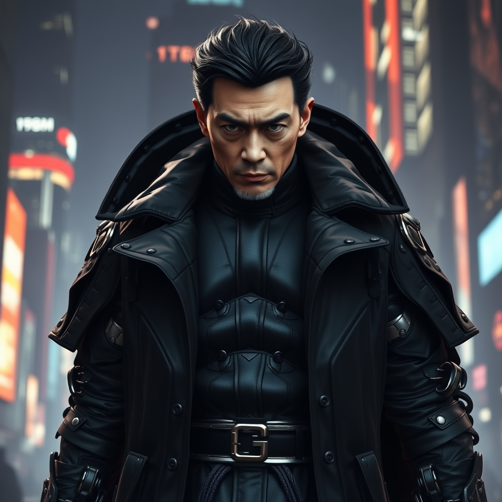 Donny Yen as a menacing futuristic supervillain, clad in an intricately detailed black coat, showcasing striking hyperrealism and photorealistic qualities, captured in stunning 8k resolution. Rendered with unreal engine precision, this 3D depiction emphasizes dramatic lighting and shadows, highlighting his formidable presence. The aspect ratio is 9:16, with an expressive style that brings out the depth of his character, set against a dystopian cityscape backdrop. The scene is dynamic, with subtle sci-fi elements enhancing the overall intensity.
