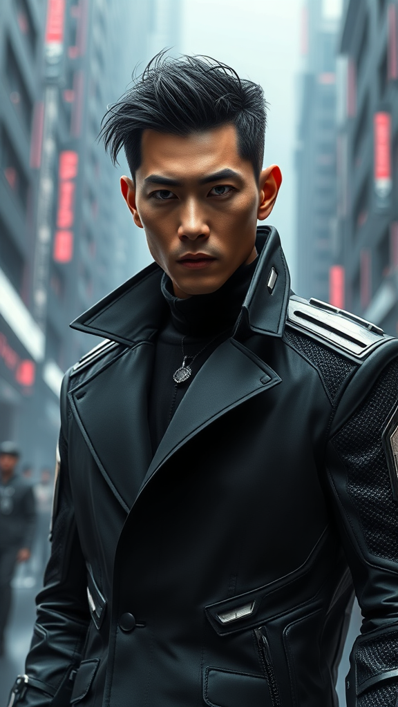 Donny Yen depicted as a sleek, futuristic antagonist, wearing an intricately detailed black coat that shimmers with advanced technology, set against a high-tech dystopian backdrop. His intense gaze and poised stance exude power and intelligence, with elements of cybernetic enhancements subtly integrated into his appearance. The scene is rendered in hyperrealistic 8k quality, utilizing a photorealistic style that showcases fine details in both his expression and attire. The environment is crafted with Unreal Engine, offering a 3D render that captures the depth and complexity of this expressive, high-stakes universe.