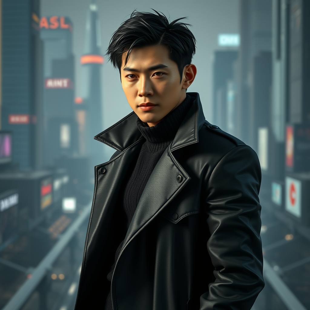 Donny Yen portrayed as a futuristic antihero in a sleek, obsidian black trench coat, set in a hyperrealistic, photorealistic future cityscape, captured in 8k resolution, powered by unreal engine technology, rendered in 3d, aspect ratio 9:16, niji 5 style with an expressive flair, cinematic lighting, detailed textures, and a dynamic pose.