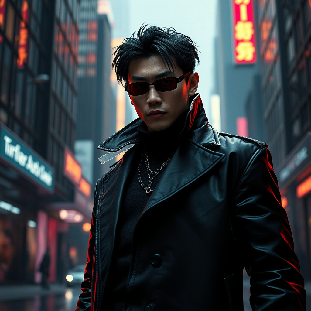 Donny Yen portrayed as an enigmatic futuristic supervillain, donning a sleek black coat, set in a cyberpunk cityscape. The scene is hyperrealistic and photorealistic, rendered in ultra-high definition 8k using the latest Unreal Engine technology, with intricate 3D modeling. The aspect ratio is a dramatic 9:16, with an expressive, mood-rich style that emphasizes the contrast between the dark attire and the neon city lights. The details are sharp and vivid, capturing each texture and shadow, reflecting a world that seamlessly blends advanced technology with cinematic allure.