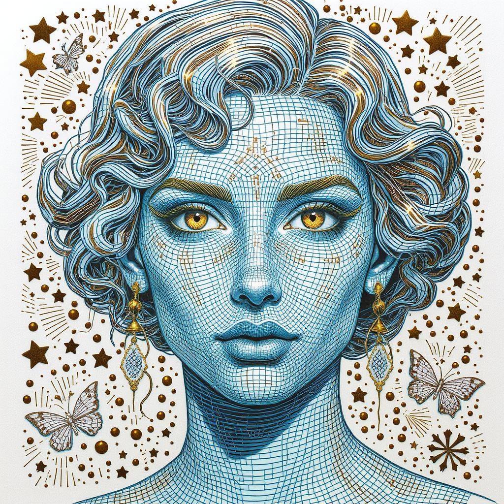 Doodle art 3D, featuring pop art-inspired portraits with intricate interference patterns and a harmonious blend of light sky-blue and bronze hues. Emphasize realistic hyper-detail and engraved line-work, reminiscent of a graphic novel. Incorporate imaginative elements that elevate the visual storytelling, maintaining a dynamic and stylized aesthetic that is both engaging and vivid.