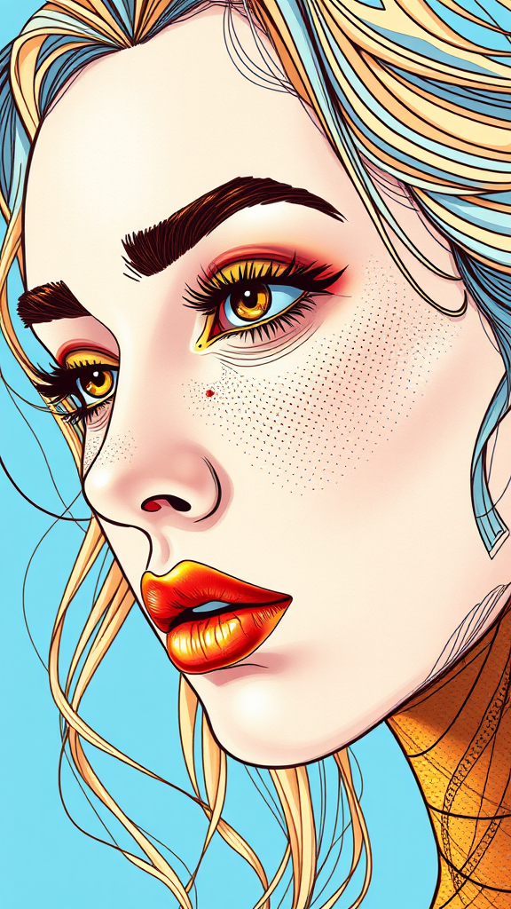 Doodle art 3D, infused with pop art-inspired portraiture, featuring an interplay of light sky-blue and bronze hues. Incorporate realistic hyper-detail and intricate engraved line-work, reminiscent of graphic novel aesthetics. Subtle interference patterns weave throughout, adding depth and dimension to the vibrant composition.