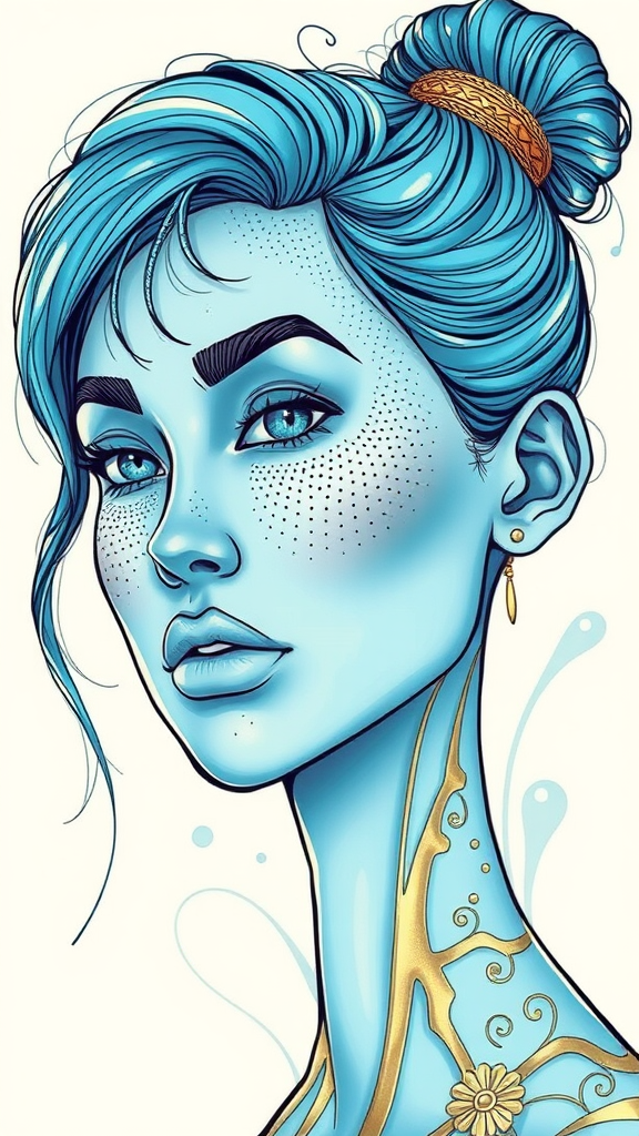 Doodle art 3D, pop art-inspired portraits with interference patterns, featuring light sky-blue and bronze hues, hyper-realistic detail, engraved line-work akin to graphic novels, tall and slender aspect ratio, artistic embellishments and stylization for a vivid portrayal.