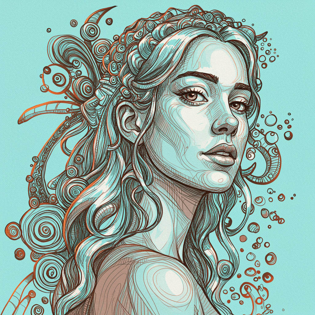 Doodle art 3D, reminiscent of pop art-inspired portraits, featuring intricate interference patterns, a harmonious blend of light sky-blue and bronze hues, with hyper-realistic detail. The composition showcases engraved line-work akin to a graphic novel aesthetic, capturing dynamic movement and expression --aspect ratio 63:128 --stylize 750 --version 6