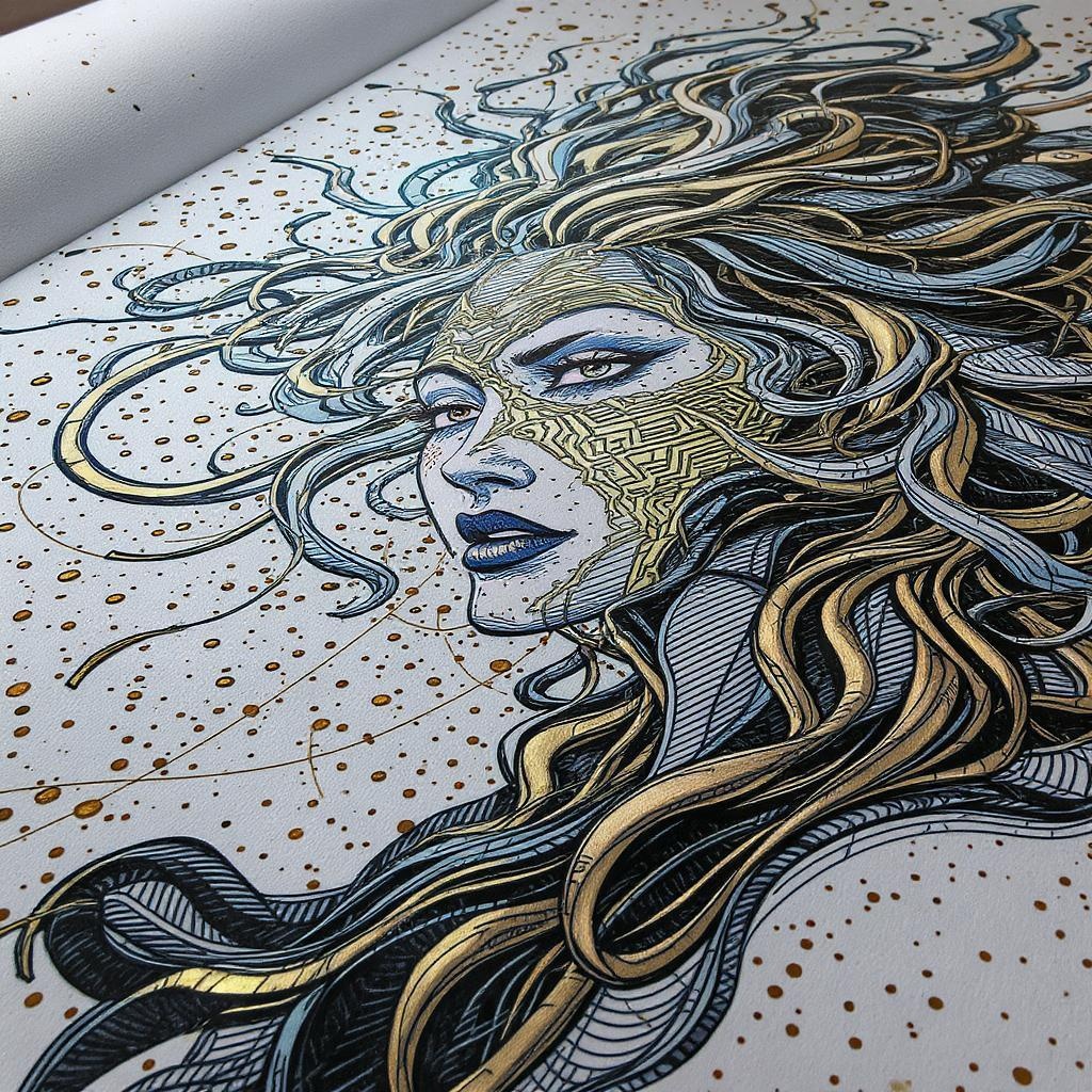 Doodle art 3D with pop art-inspired portraits, intertwining interference patterns, highlights of light sky-blue and bronze hues, depicted in realistic hyper-detail with engraved line-work. Embracing the essence of a graphic novel, this dynamic composition features elongated proportions akin to a 63:128 aspect ratio, infused with a moderate sense of stylization for a visually compelling effect.