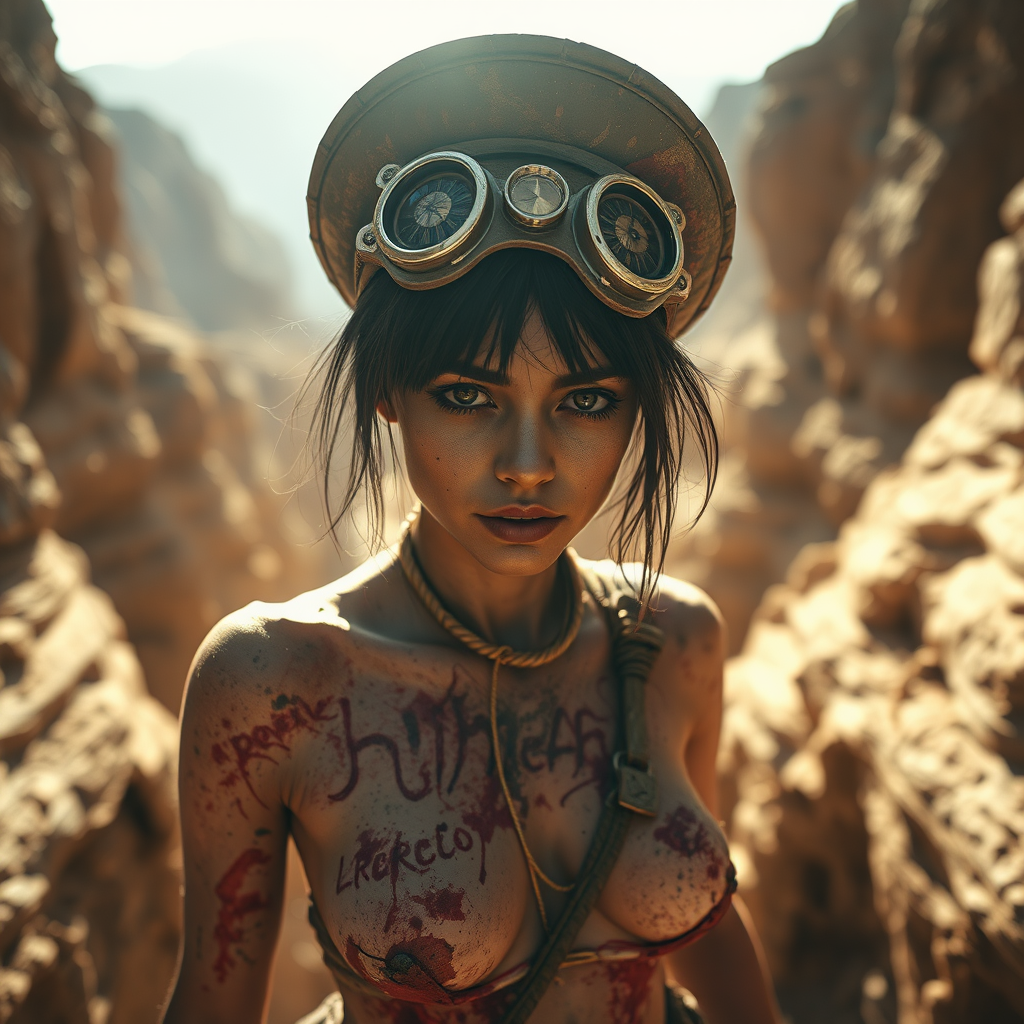 Dora the explorer queen with rotting flesh, stitched eyes, and a seductive gaze, posing in a sun-scorched ravine, camera capture, backlit, rough texture, muted colors, bereft of focal depth, baseline focus.