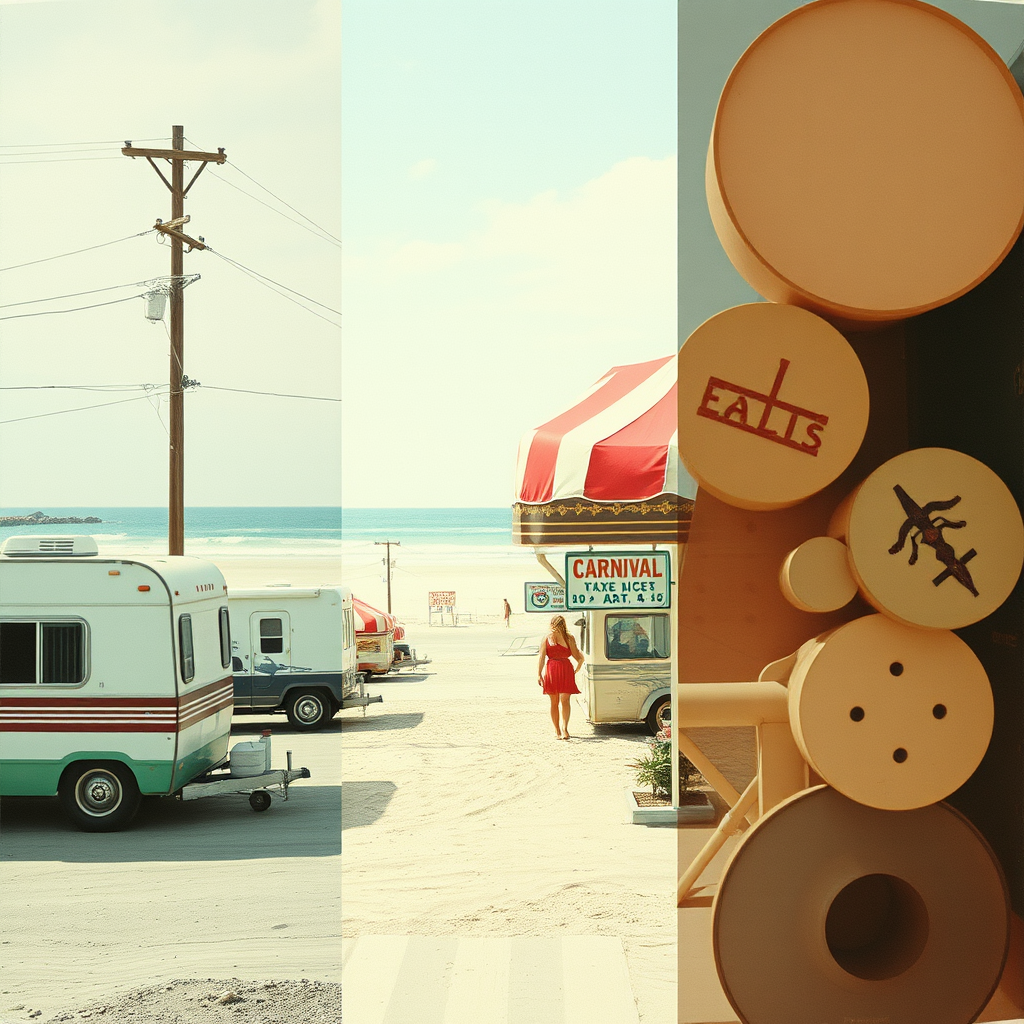 Double exposure close-up capturing the essence of medical illustration amidst a trailer park and beach setting, with industrial elements intertwined. Fine arts motifs overlap like uneven rows in a grid pattern. An extreme screen print style features faded images with expansive white and negative spaces. Large, off-center pictures appear as if cut and held by tape, creating split images with ample blank space. Circles and vintage themes are reminiscent of a Shepard Fairey-inspired carnival poster, utilizing a color overprint of light blue, red, brown, yellow, and green.