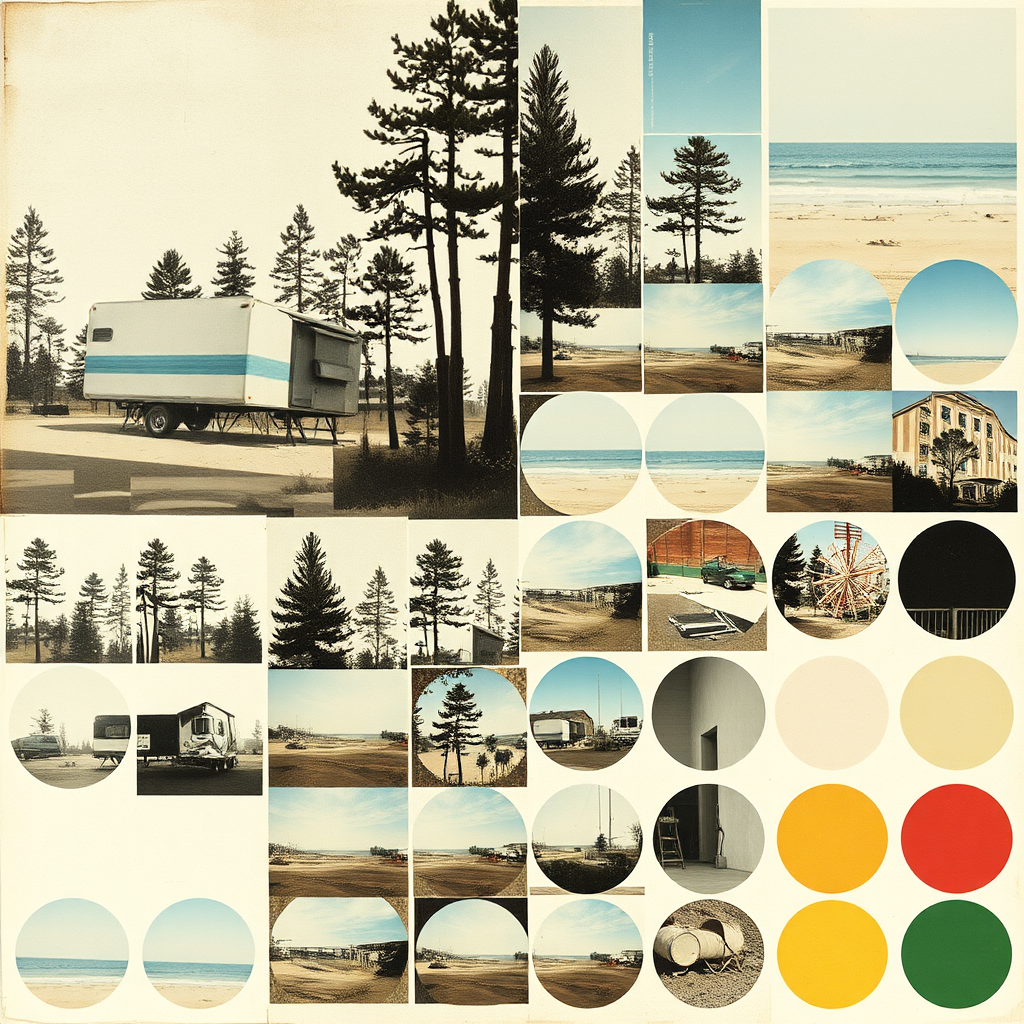 Double exposure close-up featuring a medical illustration interwoven with scenes from a trailer park and a beach; industrial elements merge into a fine arts composition with pine trees arranged in uneven rows; a grid of extreme screen print showcases faded images interspersed with white and negative space; large, off-center pictures appear cut, taped, and split; vintage circles echo a carnival poster's whimsy in Shepard Fairey style, with bold color overprints in light blue, red, brown, yellow, and green blending into the narrative.