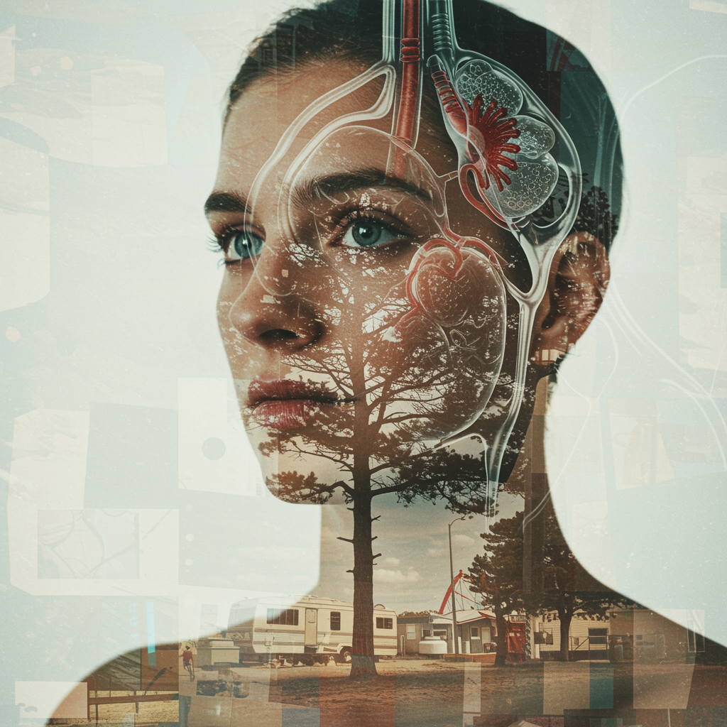 Double exposure close-up of a medical illustration set against a backdrop of a trailer park and beach, featuring overlapping industrial elements and fine arts motifs. A pine tree stands unevenly among rows and grids, reminiscent of extreme screen print style with faded images and deliberate white space. Large, off-center pictures appear cut and taped, utilizing negative space and split imagery. Scattered blank spaces and circular designs evoke a vintage aesthetic similar to Shepard Fairey’s work. Carnival poster elements with color overprints of light blue, red, brown, yellow, and green create a vibrant yet nostalgic atmosphere.