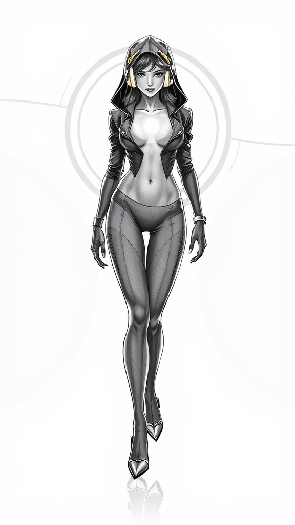 Dr. Talos stands as a monochromatic vector illustration, captured from a low camera angle. The full-body image reveals an asymmetrical perspective with dithered shading and inked outlines, reminiscent of Philip Bond's comic book style. Dr. Talos is depicted with hyperrealistic detail, her glowing chest casting light against the stark white background. Her hooded figure is accentuated by headphones that rest gently over her ears, highlighting her bare neck. Slim and narrow-hipped, she dons high heels that add to her elongated silhouette. Gold rivets detail her attire, which folds intricately over her torso. Despite the intricacy, the design remains harmonious, avoiding any distortion or mutation. The composition features circular elements subtly referenced through the shadow and light play, yet the focus remains on her radiant presence and dynamic pose, capturing the essence of a futuristic, bold character.