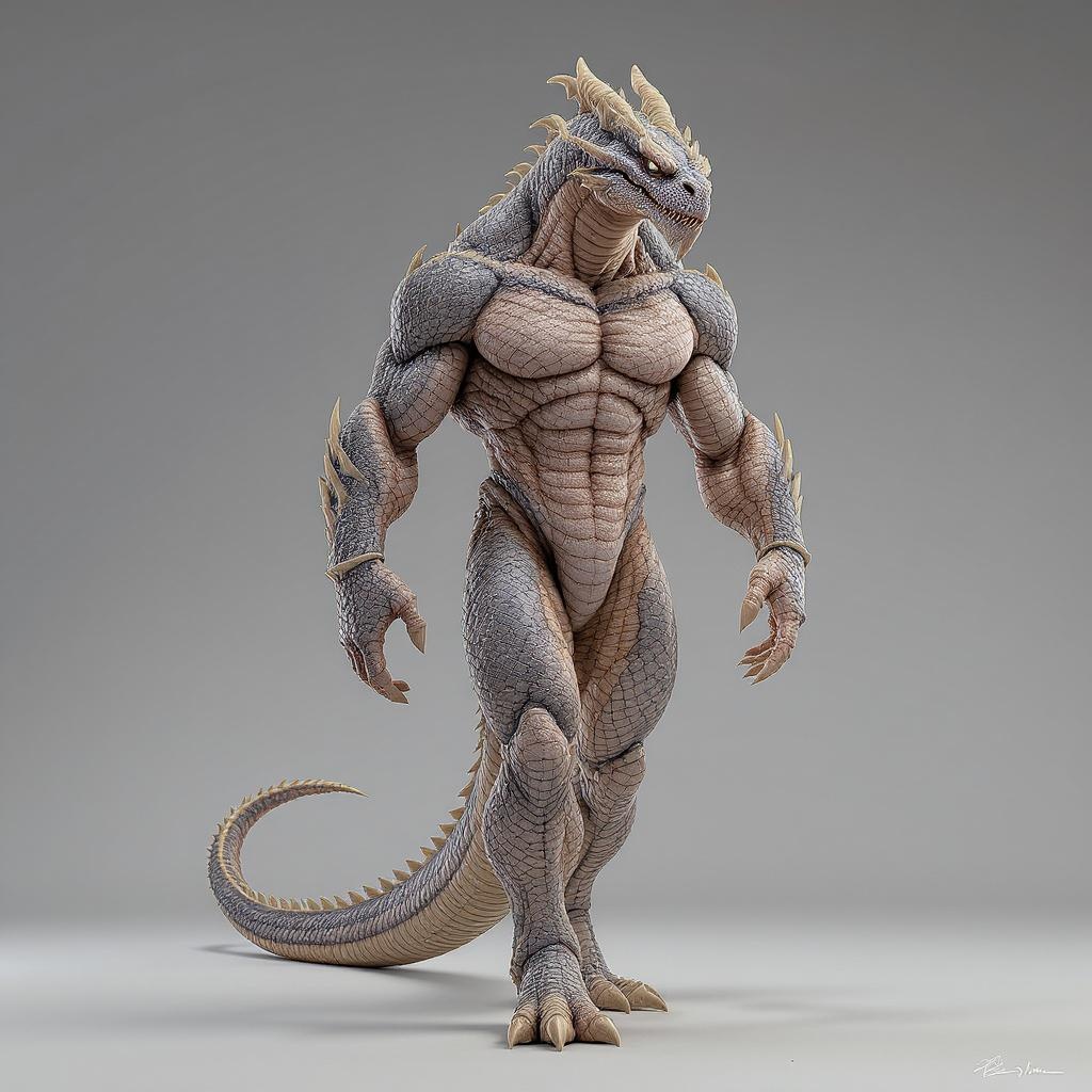 View this AI-generated image featuring a fearsome and cunning draconian stands tall a striking fusion of dragon and humanoid traits the seven foot tall figure possesses a muscular build covered in intricate dragon like scales with a detailed face its sharp piercing eyes reflect intelligence and fero