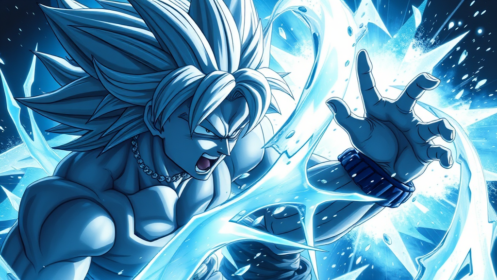 Dragon Ball anime art wall art picture featuring Dragon Ball XV, in the style of dark azure and silver, inspired by the energetic and dynamic compositions of Yanjun Cheng. The piece showcases a realistic portrayal of light and shadow with shades of light silver and light blue. The art gives a sense of movement and intensity, with elements appearing cut or ripped, adding to the dynamic nature of the composition. The piece has an enhanced visual quality reminiscent of RTX graphics, in a vertical aspect ratio of 9:16, capturing the essence of an epic Dragon Ball moment.