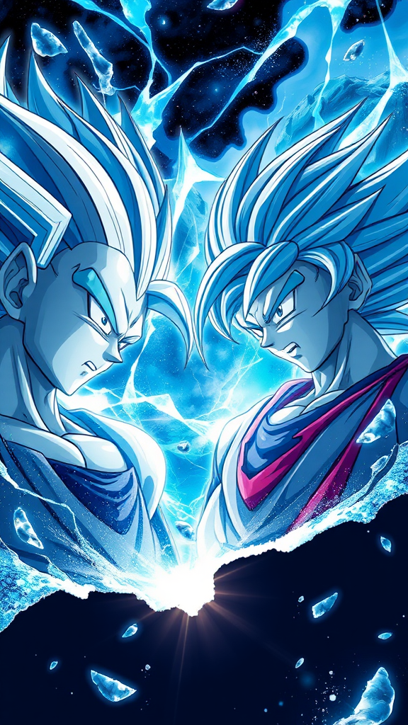 Dragon ball anime art wall image featuring iconic Dragon Ball characters, infused with elements of dark azure and silver hues, in the style reminiscent of Yanjun Cheng. The composition is energetic and dynamic, utilizing light silver and blue tones for a striking visual effect. The artwork captures a realistic portrayal of light and shadow with a polished, high-resolution finish, giving an impression similar to "RTX on" quality. The design features a unique cut/ripped aesthetic, providing depth and texture, all rendered in a captivating 9:16 aspect ratio to emphasize the epic scale of the scene.