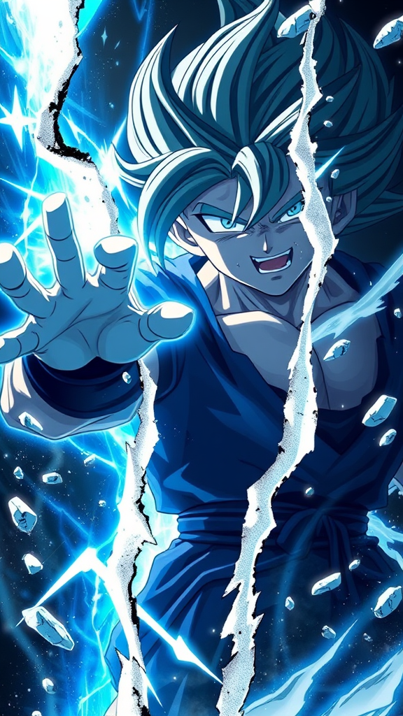 Dragon Ball anime art wall picture featuring Dragon Ball XV elements, styled with dark azure and silver tones, inspired by Yanjun Cheng, showcasing energetic and dynamic compositions. Highlighted by light silver and light blue hues, the piece features a realistic portrayal of light and shadow. The design includes a cut/ripped effect, enhanced with RTX on graphics technology, capturing an essence of action and power. Aspect ratio 9:16, sensitivity set to 750, niji version 5.