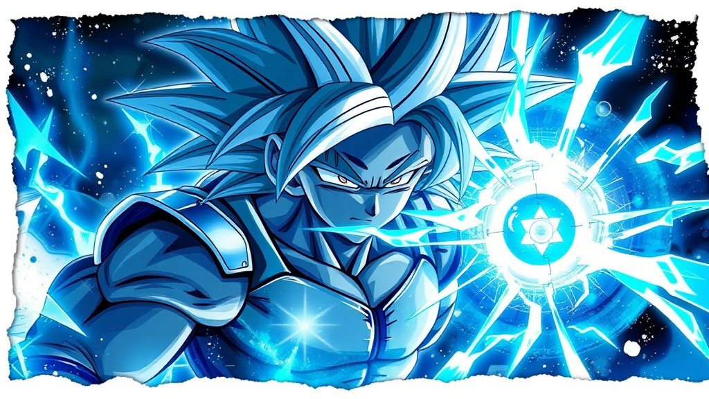 Dragon Ball anime art wall picture featuring Dragon Ball XV, in the style of dark azure and silver by Yanjun Cheng, with energetic and dynamic compositions. Light silver and light blue elements highlight the realistic portrayal of light and shadow. The artwork incorporates a cut/ripped effect, with a focus on vivid detail and enhanced visuals reminiscent of RTX on technology, captured in a 9:16 aspect ratio, with a smooth and fluid design style, hinting at a sense of motion and energy.