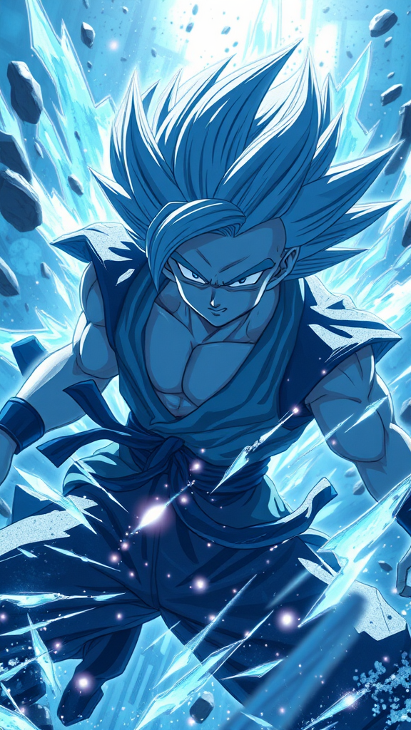 Dragon Ball anime art wall picture featuring Dragon Ball XV, in the style of dark azure and silver, inspired by Yanjun Cheng's energetic dynamic compositions, with a palette of light silver and soft blues. Capturing a realistic portrayal of light and shadow with a cut/ripped aesthetic, resembling "RTX on" quality. The scene showcases intense movement and energy, set against a dramatic 9:16 aspect ratio, with a stylized depiction that accentuates the vivid and electrifying action, subtly altered to enhance depth and intrigue without losing its core essence, invoking a sense of timeless adventure and visual allure.