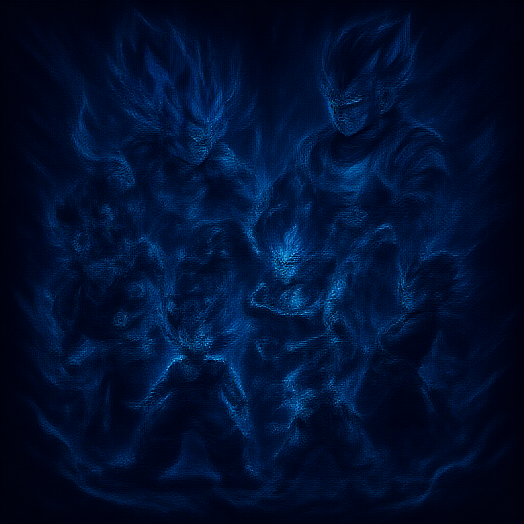 Dragon Ball anime art wall piece featuring dynamic characters from Dragon Ball XV, styled in dark azure and shimmering silver hues, inspired by the artistry of Yanjun Cheng. The artwork captures energetic and dynamic compositions with a focus on realistic portrayals of light and shadow, highlighted with light silver and blue accents. The scene is artistically cut and ripped, featuring enhanced visual elements akin to RTX on, maintaining a vibrant and action-packed atmosphere. The composition is designed with an aspect ratio of 9:16, evoking a sense of motion and intensity.