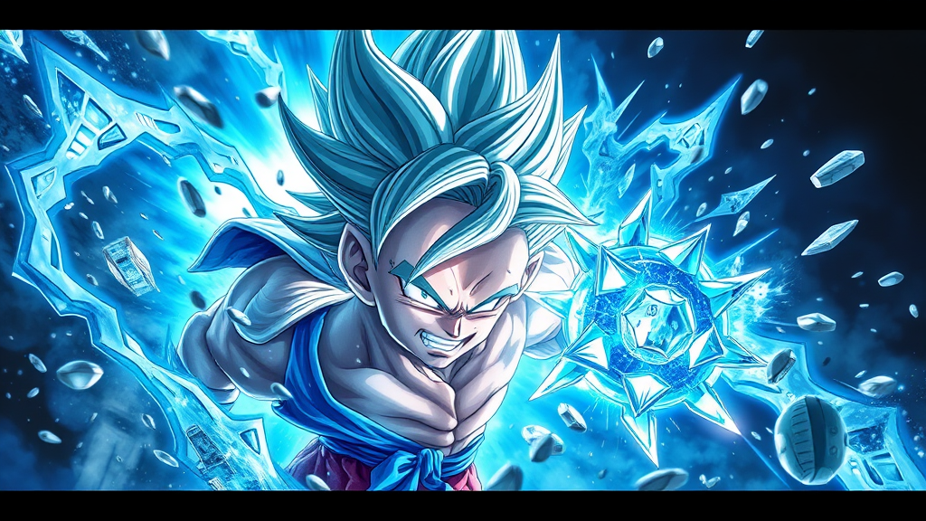 Dragon Ball anime wall art featuring vibrant Dragon Ball XV elements, inspired by the dark azure and silver palette. Emulating Yanjun Cheng's style, the piece showcases energetic and dynamic compositions with realistic portrayals of light and shadow in light silver and blue tones. The artwork incorporates a cut/ripped aesthetic with heightened realism, RTX on, captured in a vertical aspect ratio of 9:16, lending an immersive and modern feel.