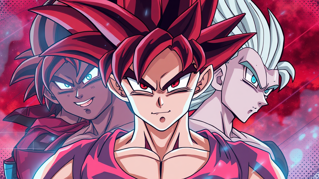 Dragon Ball art with a solarization effect, featuring charming anime characters in a palette of dark red and gray tones, complemented by dark silver and sky-blue highlights, showcasing heavy shading and handsome features in ultra-high definition, capturing dynamic and engaging visuals with a stylized aesthetic.